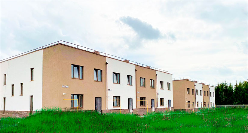 Одним из примеров строительства таунхаусов с плоской кровлей является жилой комплекс «Свой комфорт» в Нижегородской области. Поселок представляет собой благоустроенную уютную территорию с дорожками, подведенными коммуникациями, детскими и спортивными площадками, яркой зеленью. В шаговой доступности - магазины, пункты выдачи маркетплейсов, детсад, аптеки. Общая площадь таунхаусов составляет порядка 6 000 м². Для устройства долговечной гидроизоляции кровли таунхаусов была выбрана армированная полиэстеровой сеткой ПВХ-мембрана LOGICROOF V-RP компании ТЕХНОНИКОЛЬ.
